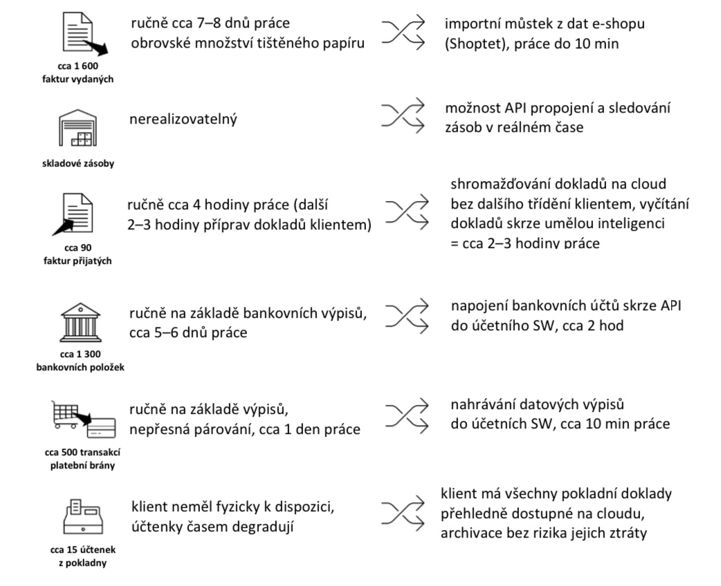 Tímto ušetří čas také klienti, kteří nemusí trávit hodiny přípravou dokladů. Dobře si pamatujeme doby, kdy jsme účtovali několik stovek vydaných faktur ručním zápisem a musíme uznat, že na ně nevzpomínáme s velkým nadšením.